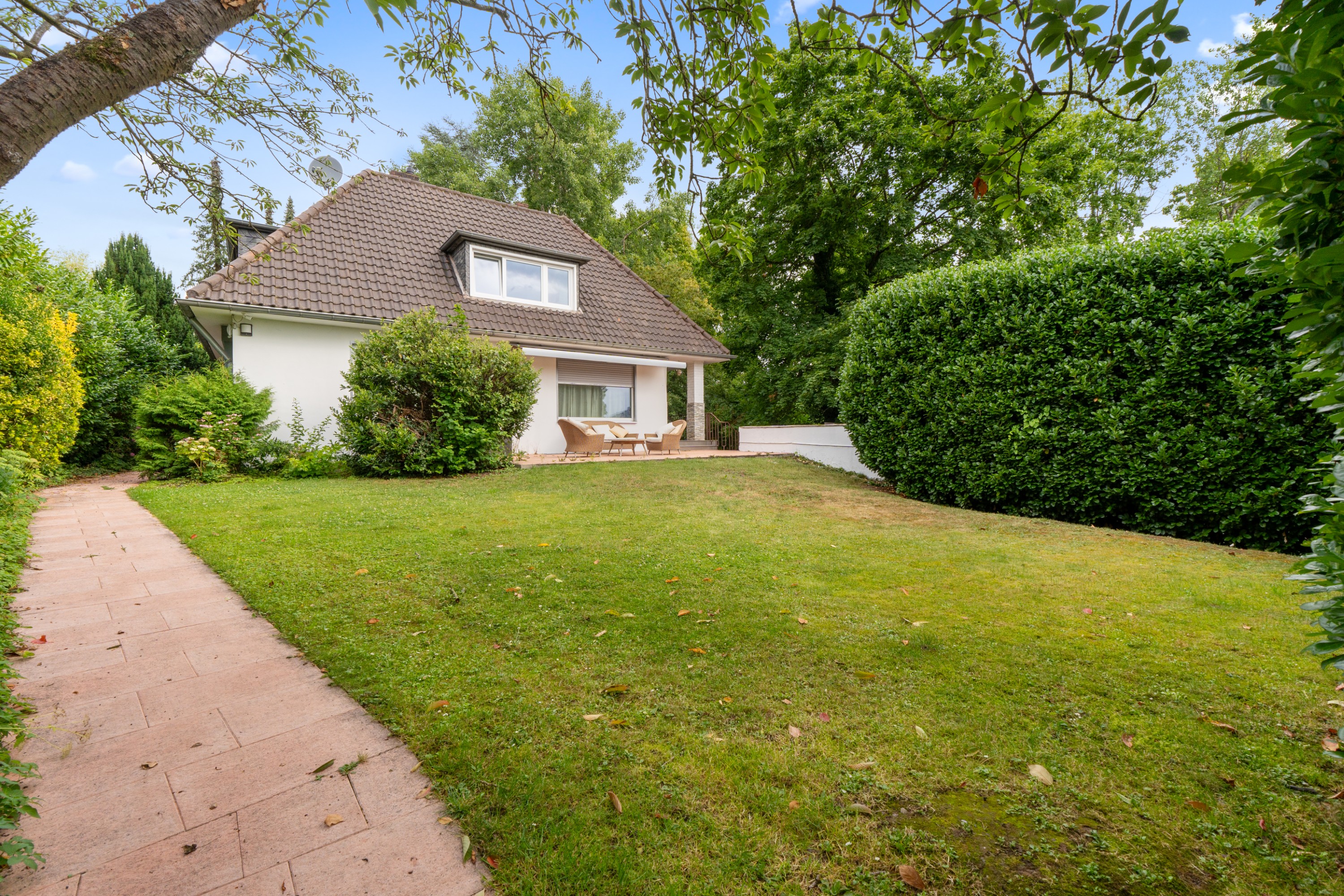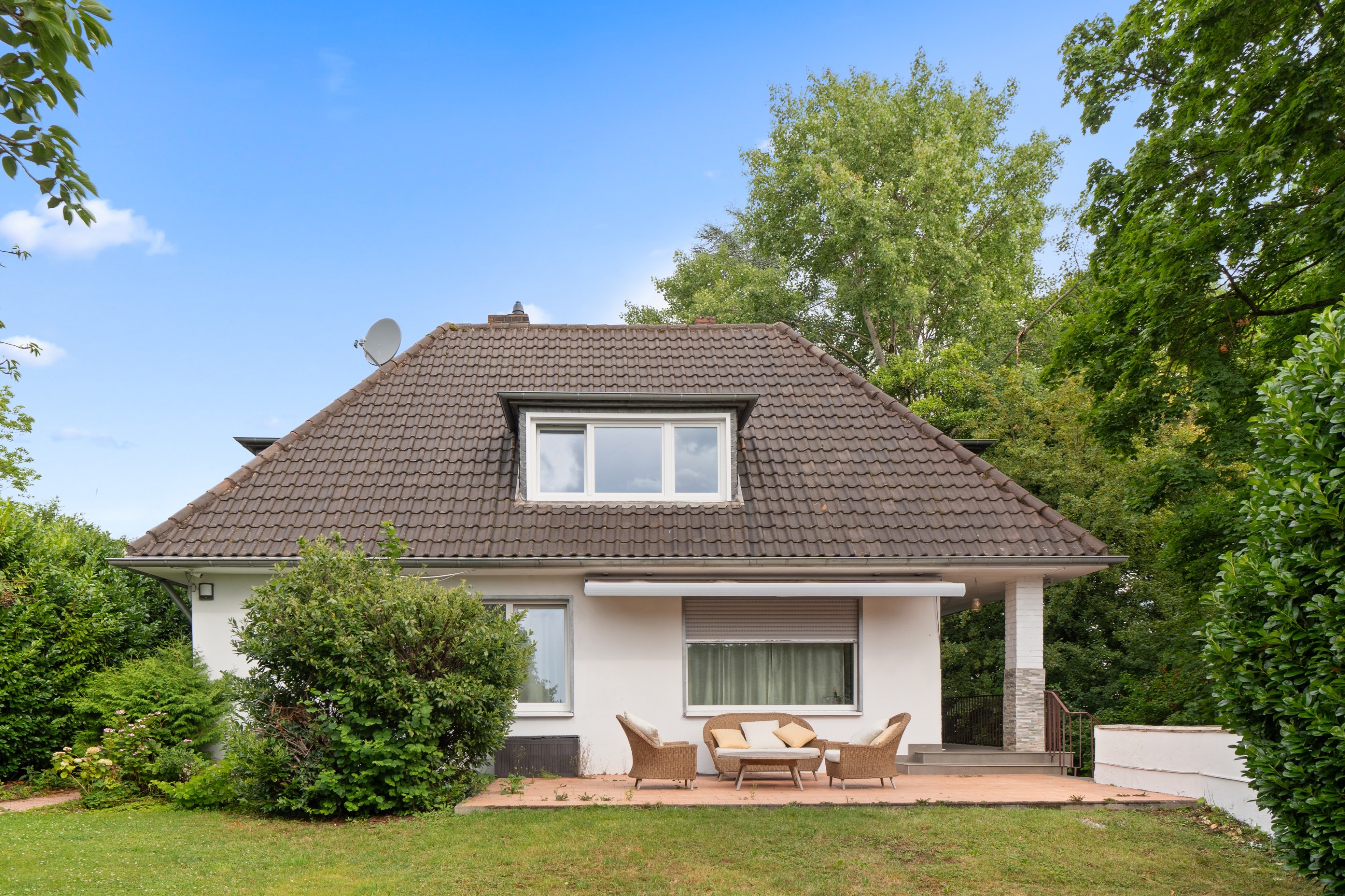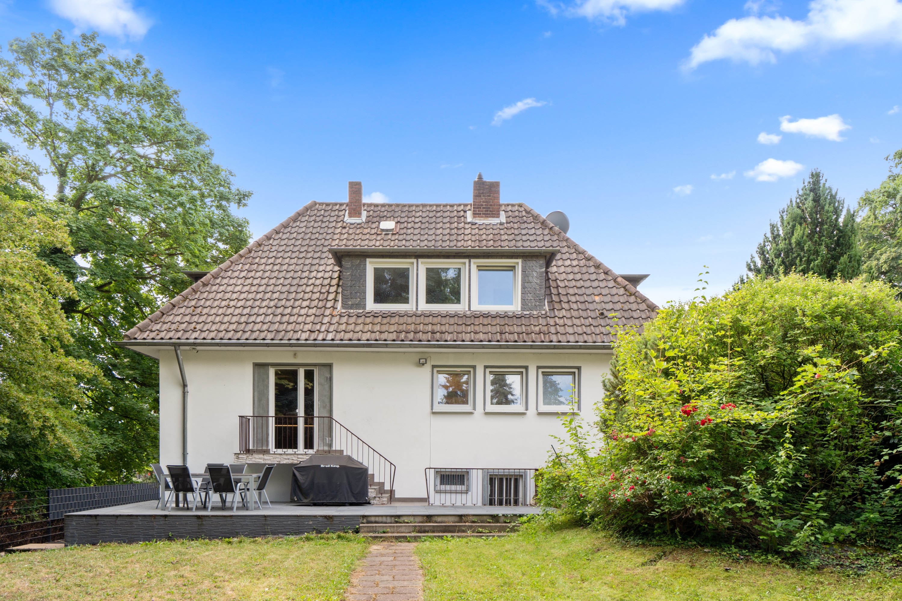 Das Haus befindet sich in einer ruhigen Wohngegend und bietet durch den großen Garten, die Terrassen und den Balkon die Möglichkeit, die Natur zu genießen. Die nahegelegenen Einkaufsmöglichkeiten, Schulen und öffentlichen Verkehrsmittel machen das Haus zu einem idealen Wohnort für Familien. Mit der Garage und dem Keller bietet die Immobilie zudem ausreichend Stauraum.