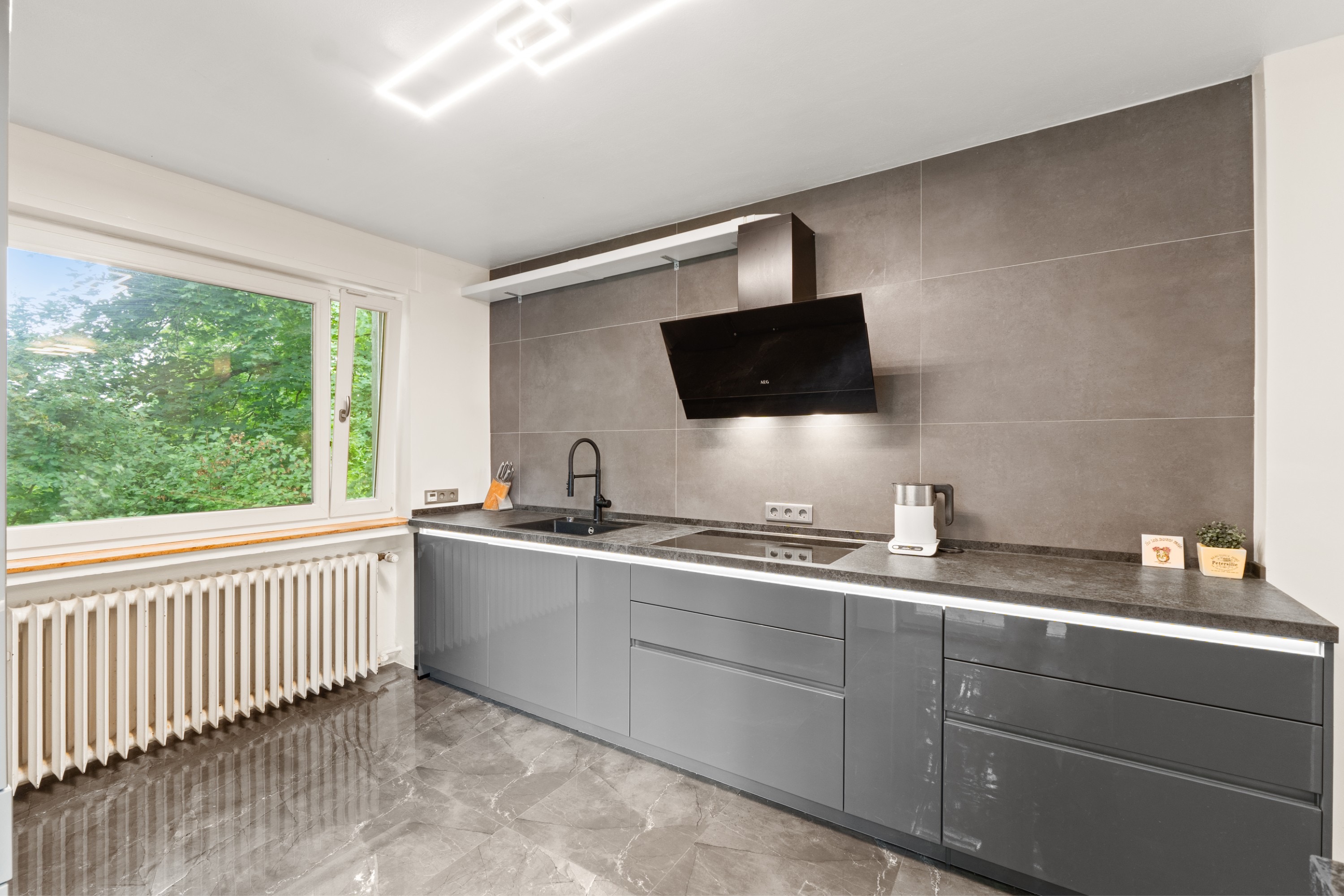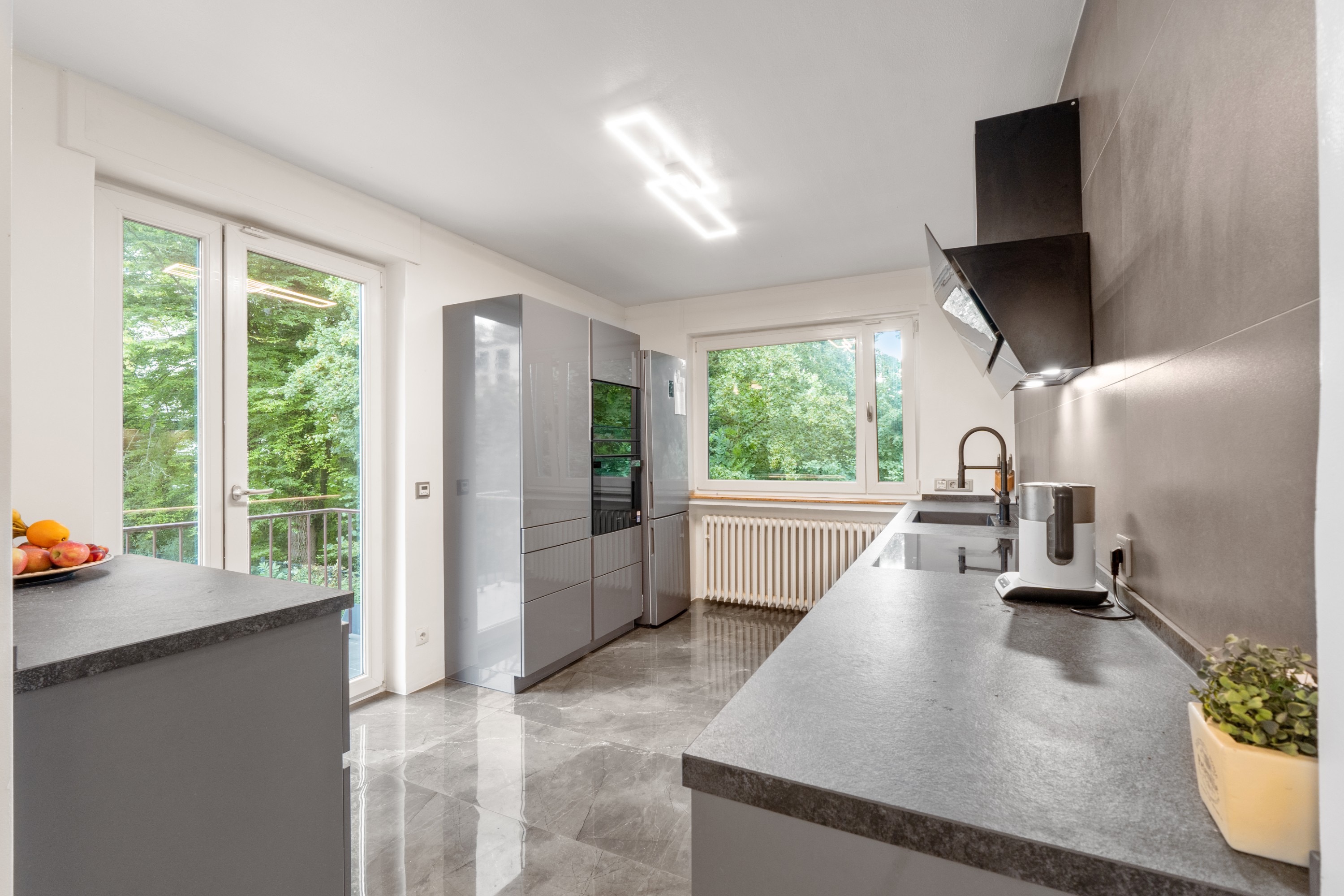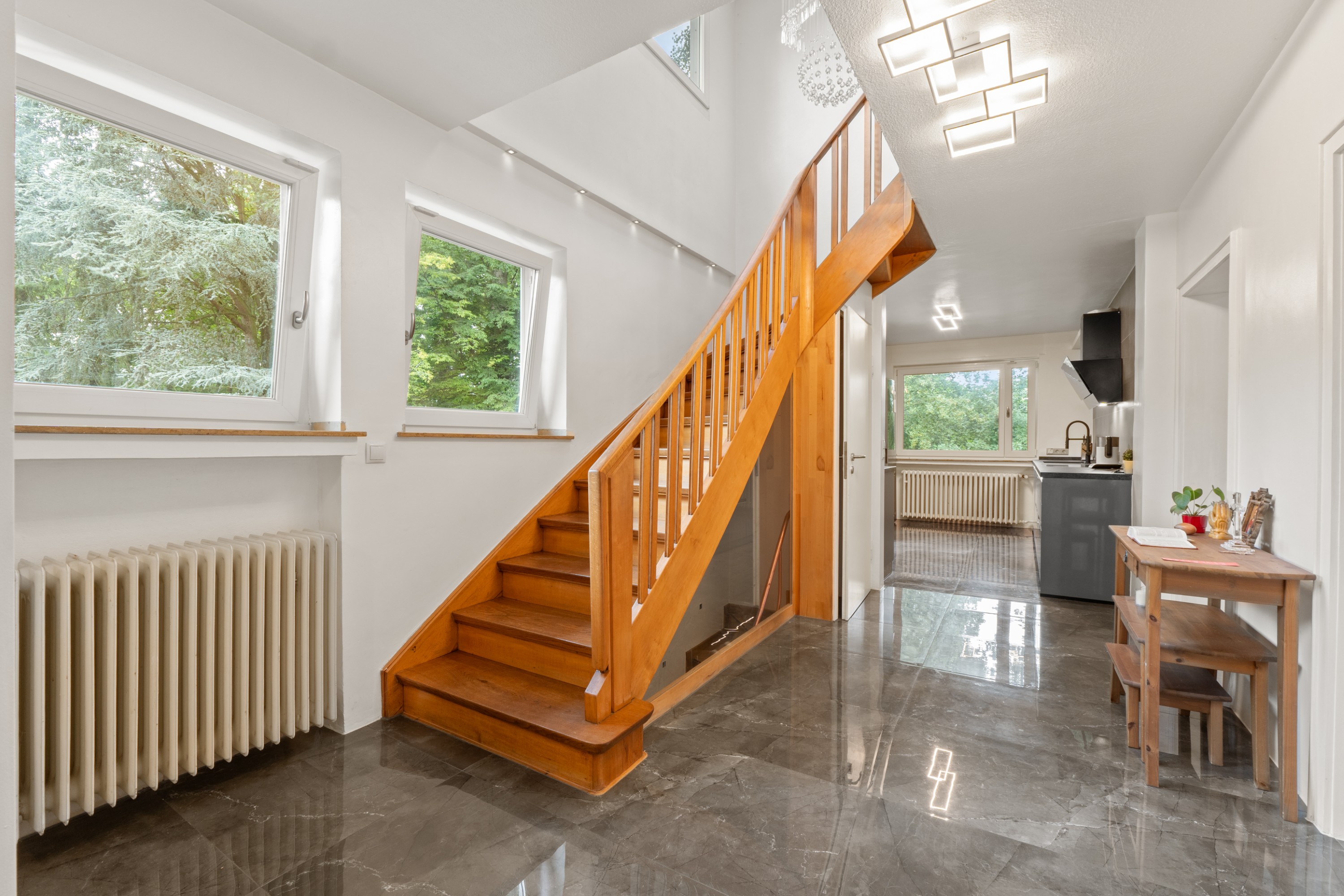 Herzstück des Hauses ist das große Wohn-/Esszimmer mit angrenzendem Balkon und Zugang zur Terrasse, wo Sie mit Blick in den Garten entspannte Stunden verbringen können. Angrenzend befindet sich die Küche, die Ihnen viel Arbeitsfläche bietet.