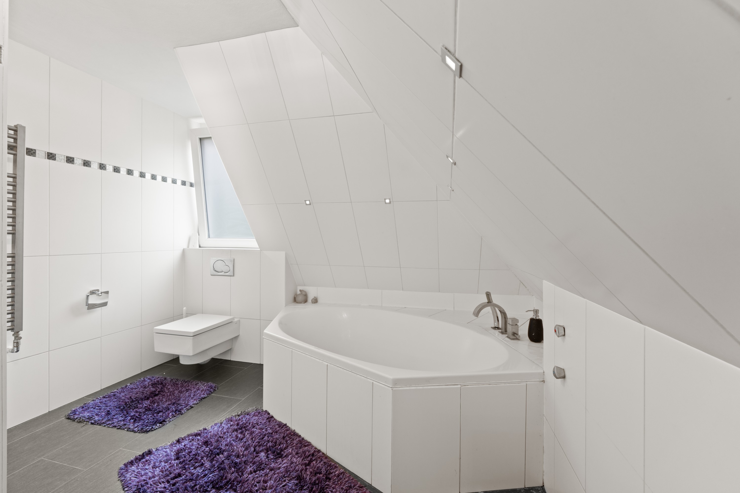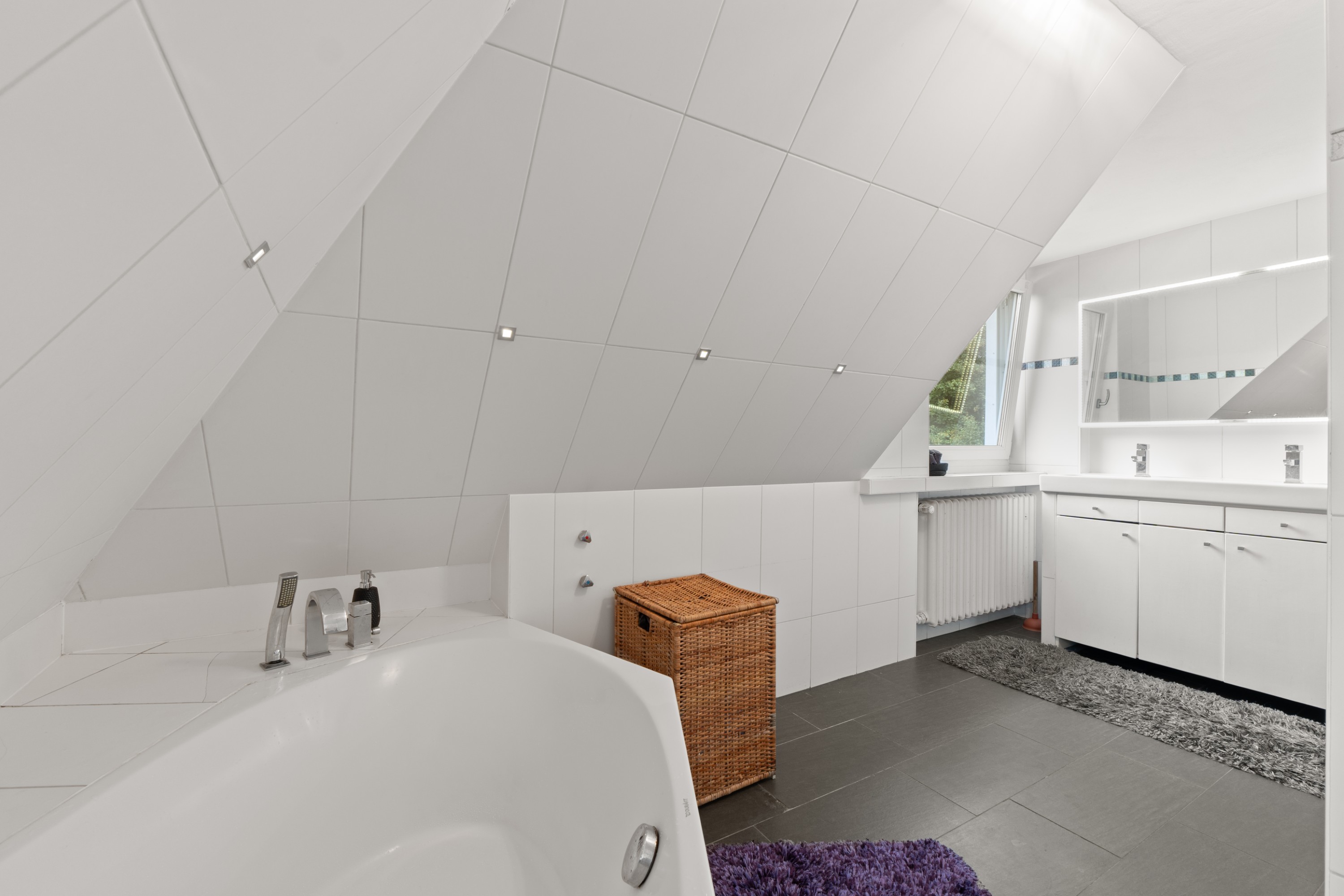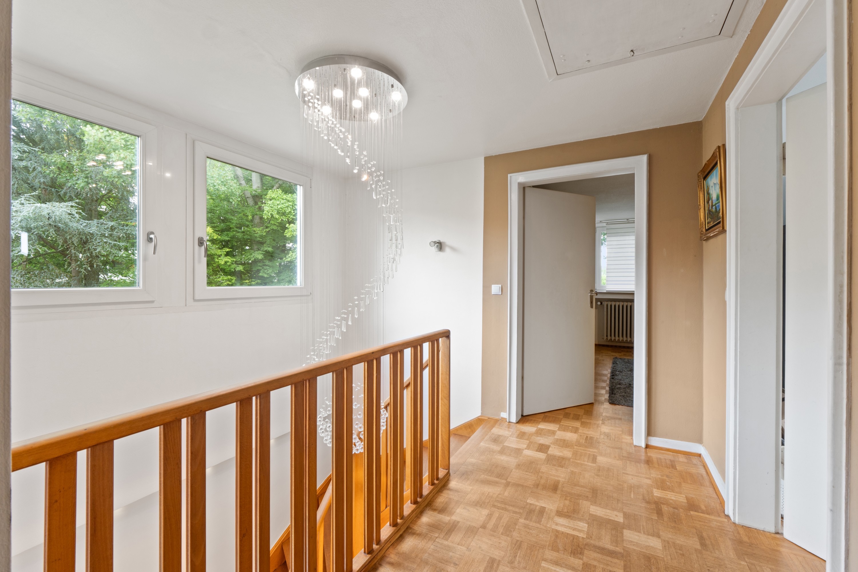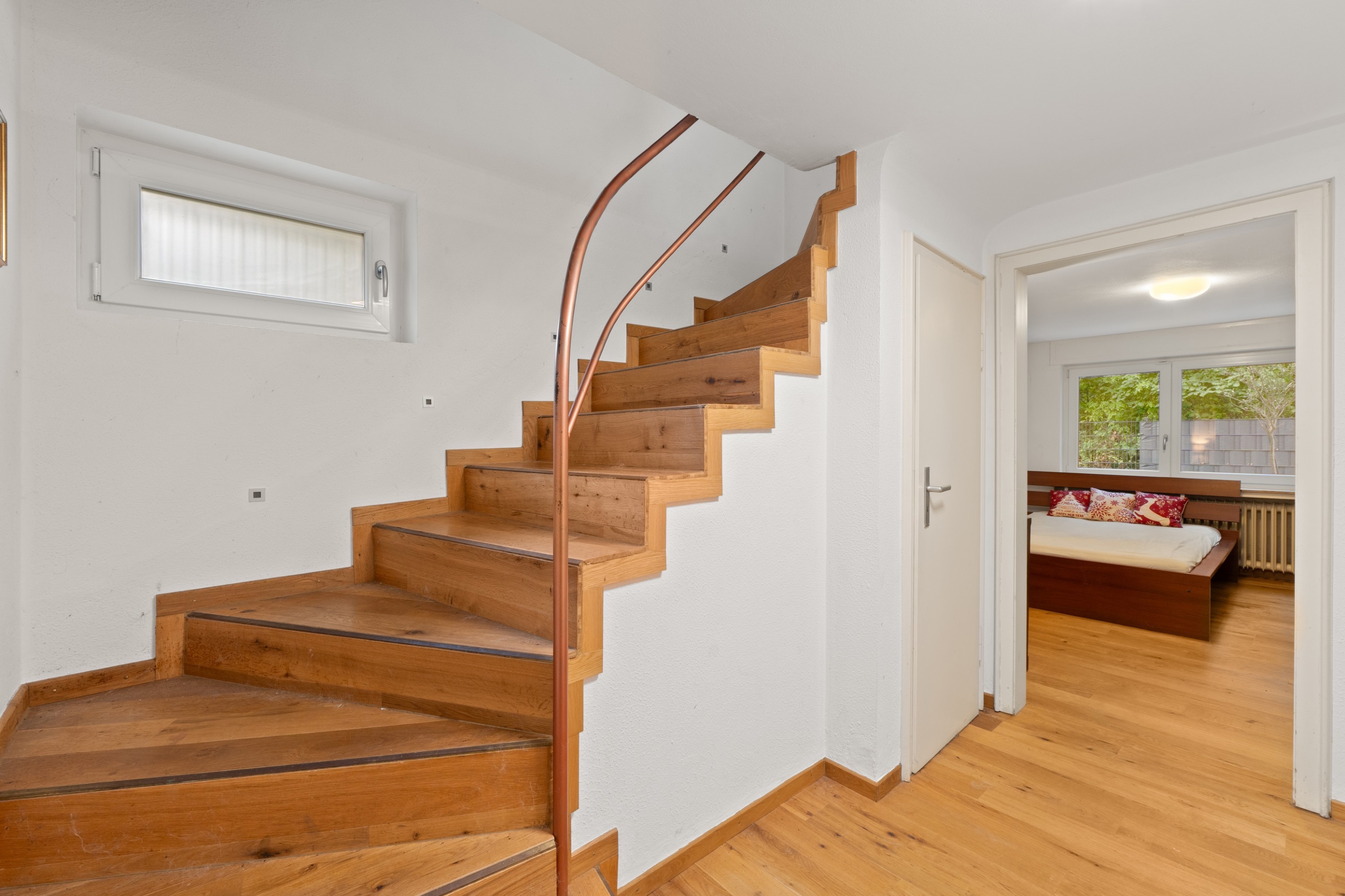 Im Inneren des Hauses befinden sich fünf Schlafzimmer- drei sind im Obergeschoss, zwei befinden sich im Untergeschoss. Auf jeder Schlafebene gibt es ein Badezimmer. Im EG ist ein Gäste-WC integriert.