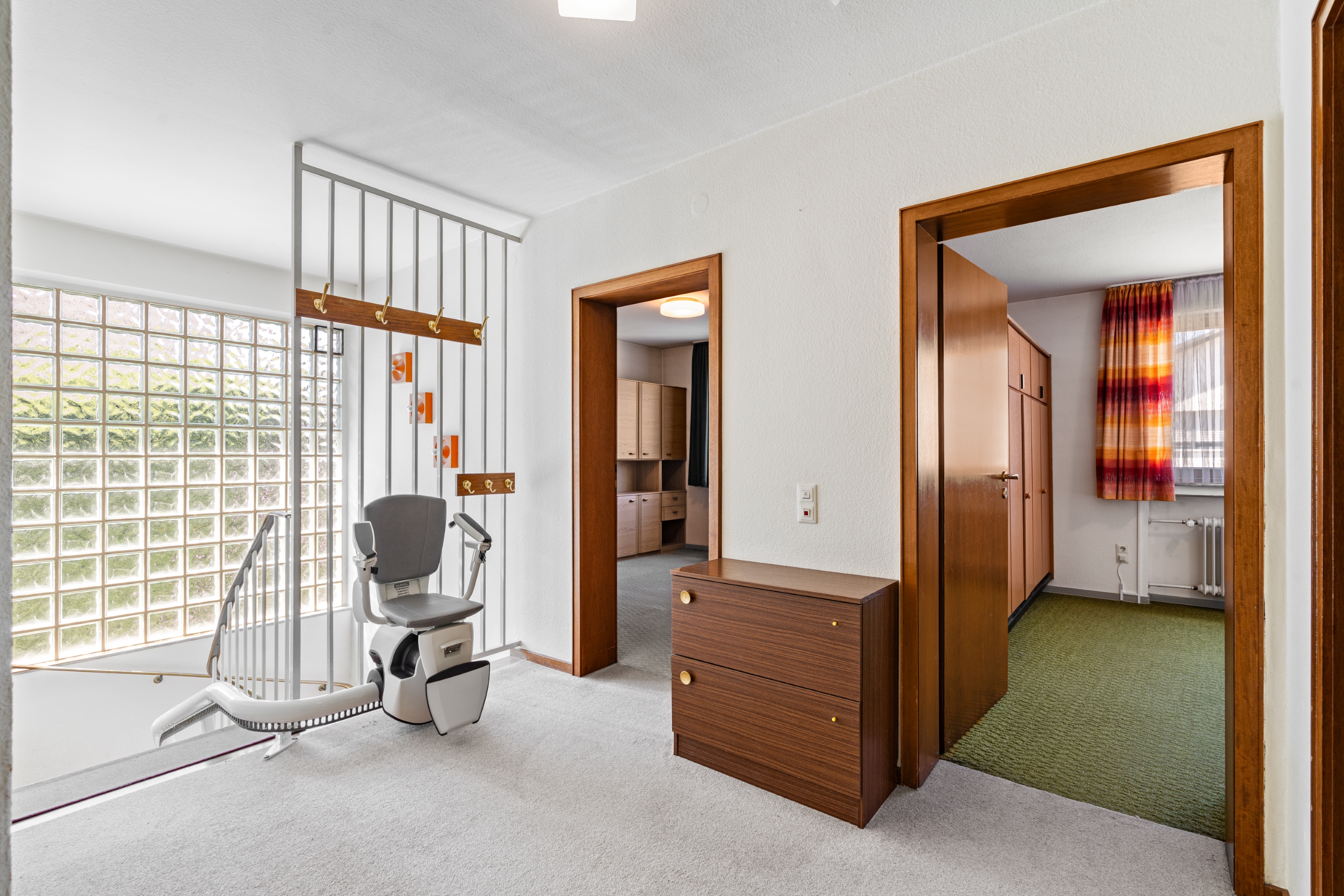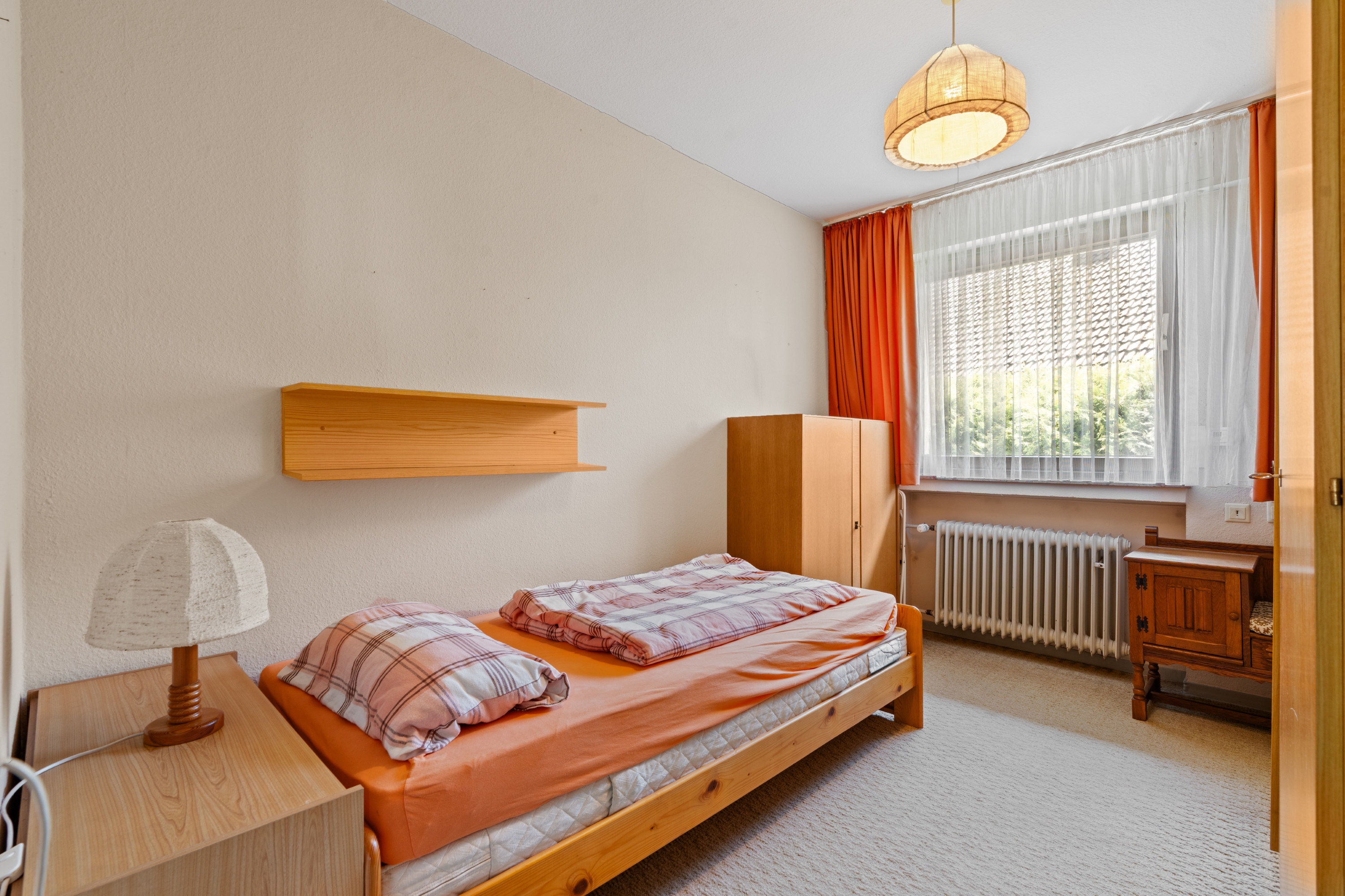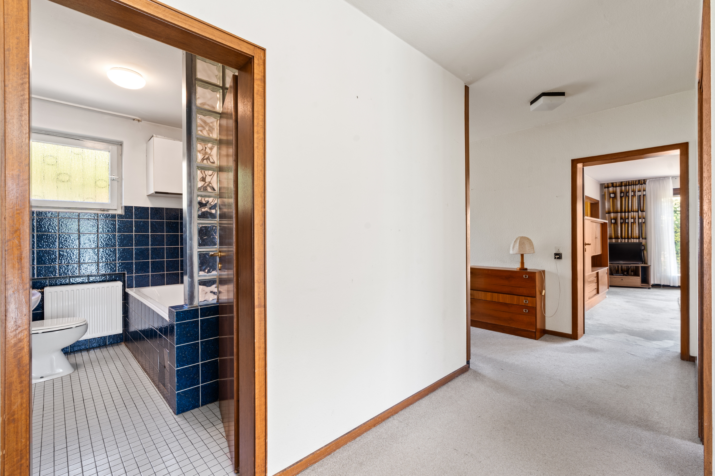 Ein flexibel nutzbares Zimmer am Ende des Flurs eignet sich ideal als Kinder-, Gäste- oder Arbeitszimmer. Ergänzt wird das Erdgeschoss durch zwei weitere Schlafzimmer sowie ein Tageslichtbad mit Badewanne, Dusche und WC.