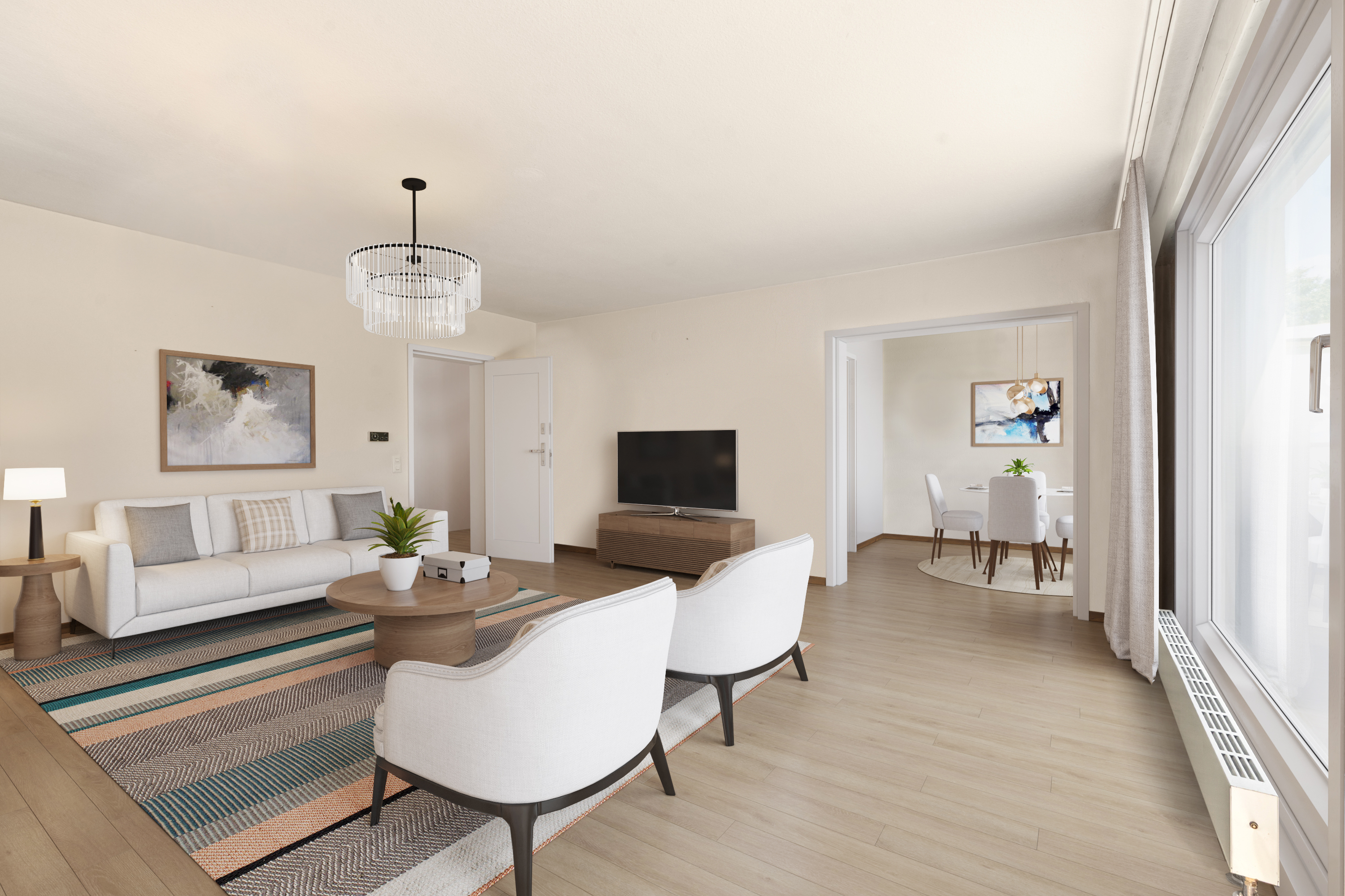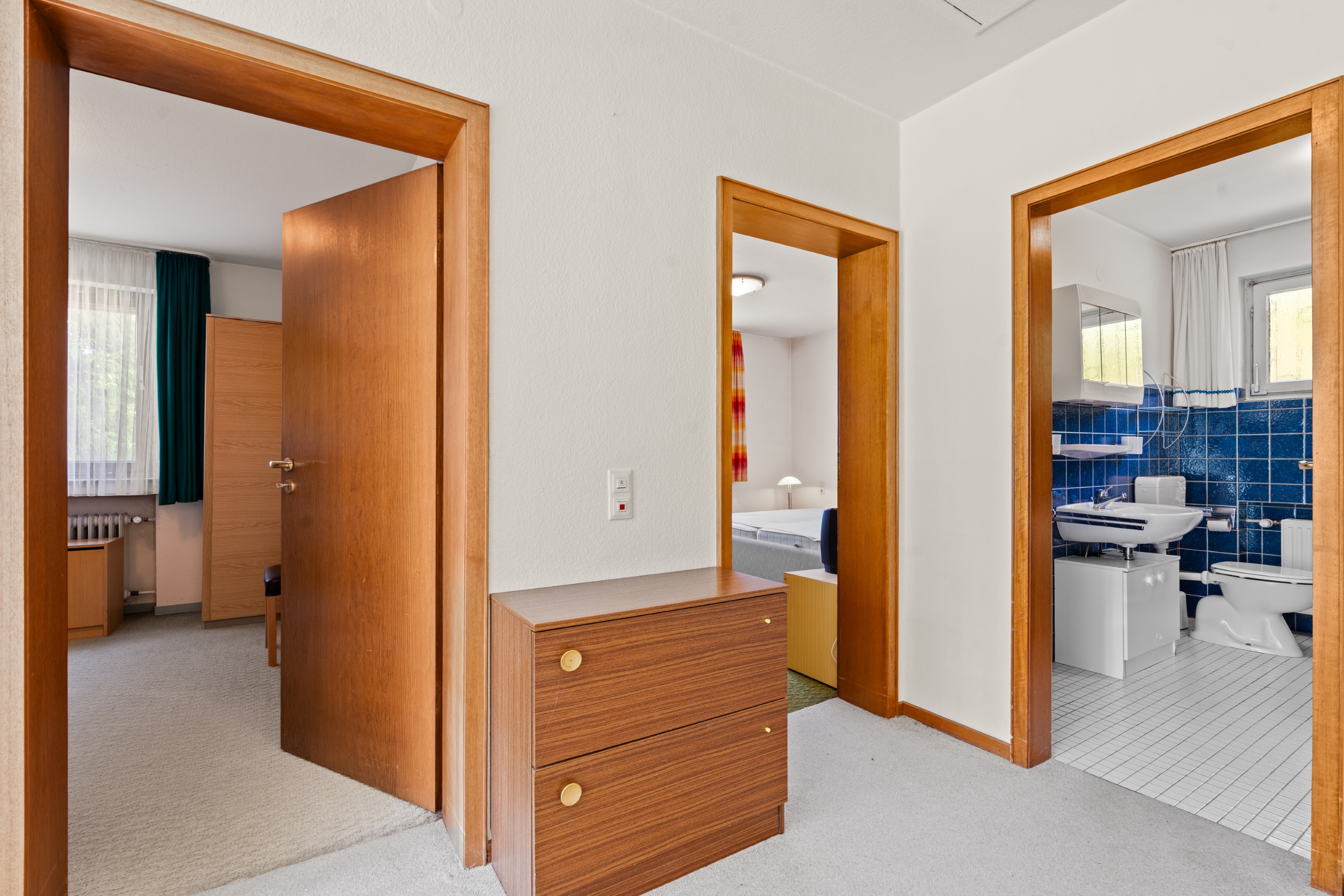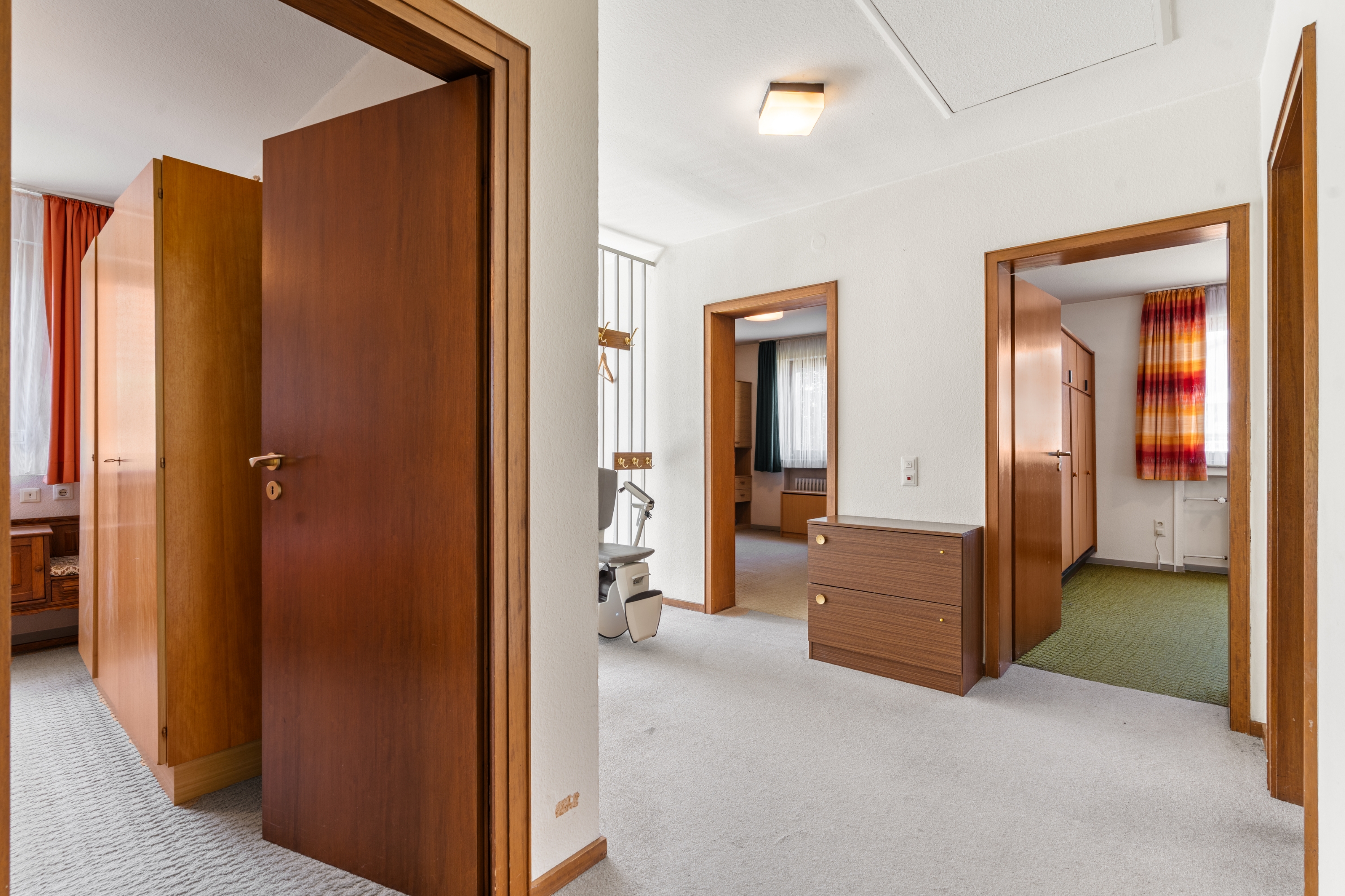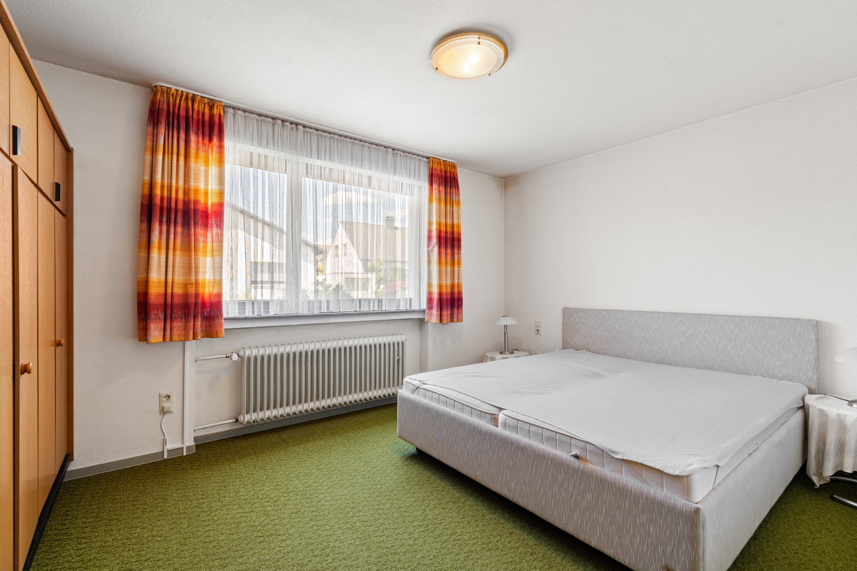 Ein flexibel nutzbares Zimmer am Ende des Flurs eignet sich ideal als Kinder-, Gäste- oder Arbeitszimmer. Ergänzt wird das Erdgeschoss durch zwei weitere Schlafzimmer sowie ein Tageslichtbad mit Badewanne, Dusche und WC.