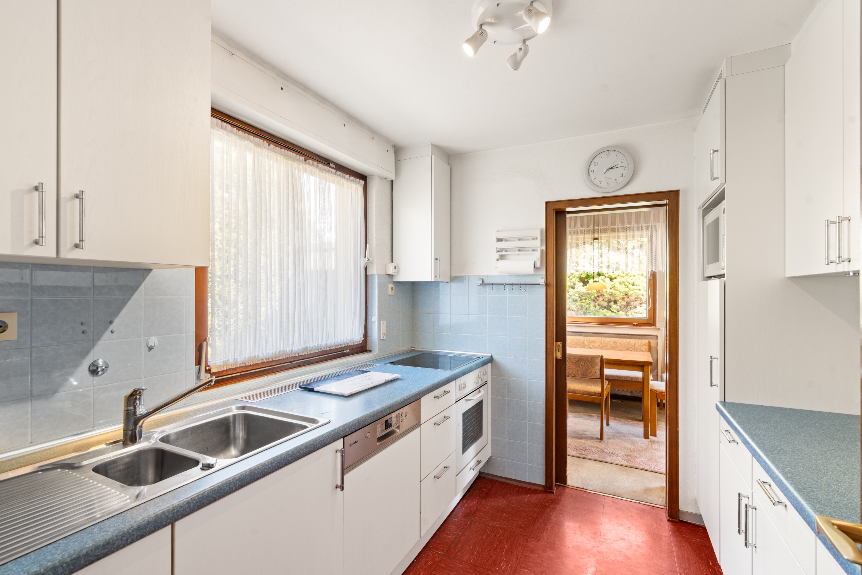 Beim Betreten des Hauses befinden sich rechter Hand ein Gäste-WC und eine praktische Abstellkammer. Auf der linken Seite liegt die separate Küche mit direktem Zugang zum großzügigen Wohn- und Essbereich. Dieser besticht durch seine Helligkeit, eine offene Raumwirkung und den direkten Ausgang auf die Terrasse mit Markise sowie in den liebevoll angelegten Garten.